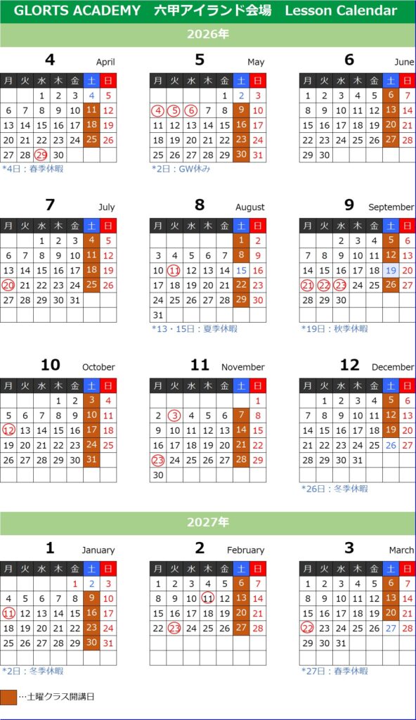 GLORTS ACADEMY六甲アイランド レッスンスケジュール(2026.4~2027.3)