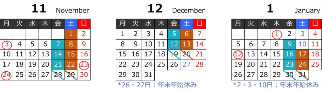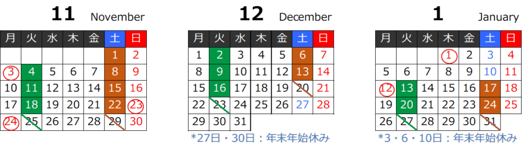 ※祝日などの休校日および各月最終週は体験受付しておりませんので、下記のカレンダーにてご確認ください。