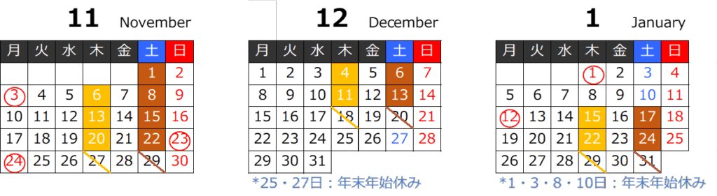 ※斜線の入っている日は、受入の都合またはアカデミー会員テスト回(毎月最終週)につき体験参加ができません。
